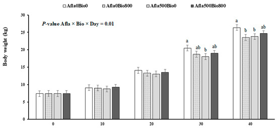 | % liver weight by body weight | 2.36 b | 2.57 a | 2.37 b | 2.43 ab | 0.03 | 0.024 | 0.001 | 0.265 |