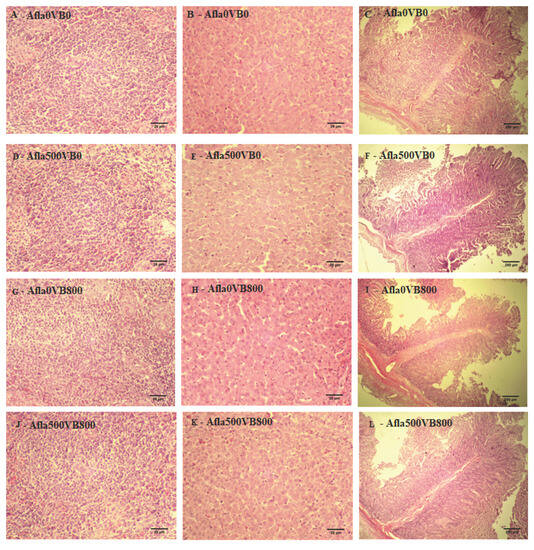 | Afla0VB0 (n = 6) | Afla500VB0 (n = 6) | Afla0VB800 (n = 6) | Afla500VB800 (n = 6) | Afla × | Afla | VB | ||