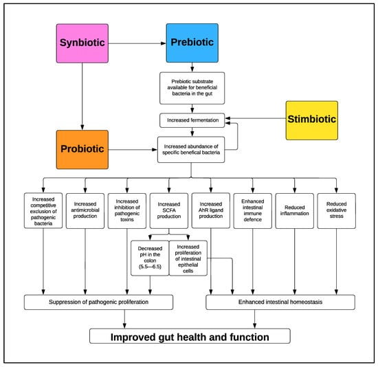 Mode of action of probiotics, prebiotics, synbiotics and stimbiotics in the GIT [21].