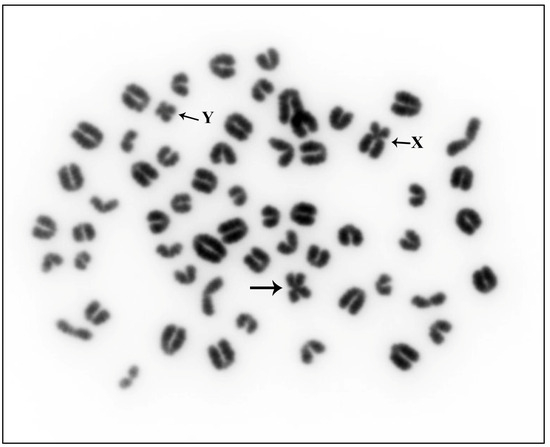 The observation of Giemsa-stained metaphases obtained from Alpine Grey cattle revealed a karyotype of 2n = 59, XY, characterized by the presence of an abnormal small metacentric chromosome (Figure 1).