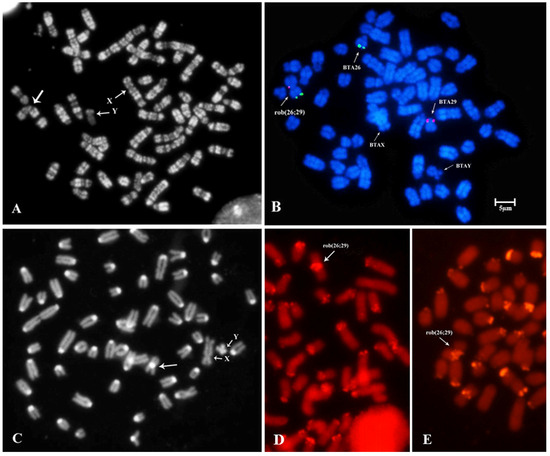 Rob(26;29) was originally discovered many years ago in the Alpine Grey cattle through studies conducted by Giovanni et al. and later confirmed by Meo et al. [4,5]. Notably, continuous early screening efforts have been ongoing since then, and remarkably, no carrier of this anomaly has been identified since 2006. It is intriguing that despite the passage of many generations, the anomaly has persisted as a dicentric structure. The NGS analysis of the reads’ distributions obtained from this study provides valuable insights into the chromosomal involvement in the anomaly. The results clearly demonstrate the presence of the BTA26 and BTA29 in the derivative chromosome (Figure 2). These findings were further substantiated through RBA- and CBA-banding and FISH-techniques with specific molecular markers (Figure 3A–E).