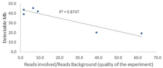 We used a simple correlation analysis to determine the suggested approach’s detection limit for genomic regions associated with anomalies. We recognize that experimental quality, defined as the ratio of average reads for the chromosomes involved to overall average reads, is critical. Low quality can enhance background noise, thereby masking any signals from genetic peaks or fragments. With specific calculations (supplied in the Supplementary Information), the simulation of the number of reads necessary to obtain an Le value of 4 forms the basis of this strategy.