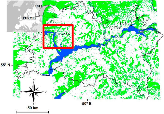 The location of Tatarstan and the city of Kazan in relation to the continents of Europe and Asia. The study area is outlined. Shading represents forests.