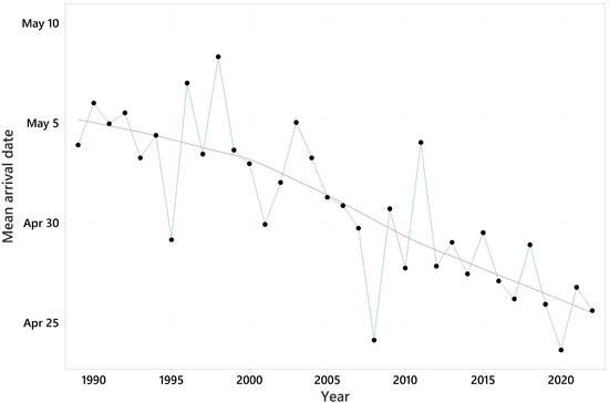 Mean first arrival date over 31 species for each of the years 1989–2022. LOWESS trend line superimposed.