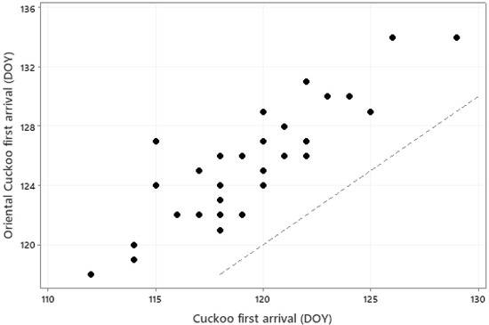 Mean first arrival date (DOY) for the Cuckoo Cuculus canorus and Oriental Cuckoo Cuculus optatus in each of the years 1989–2022 (r = 0.844, p < 0.001). The dotted line is a line of equality.