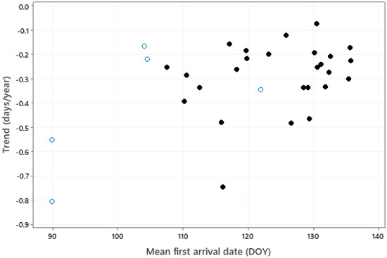 The relationship (r = 0.461, p = 0.009) between trend in first arrival date and mean arrival date (DOY, 91 = April 1, 121 = May 1). Solid symbols represent long-distance (intercontinental) migrants, open symbols represent medium-distance (intracontinental) migrants.