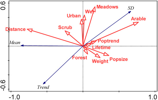 An RDA summarising the relationship between (i) mean first arrival dates, SD of first arrival dates, trend in first arrival date, and (ii) species traits, is summarised in Figure 6.
