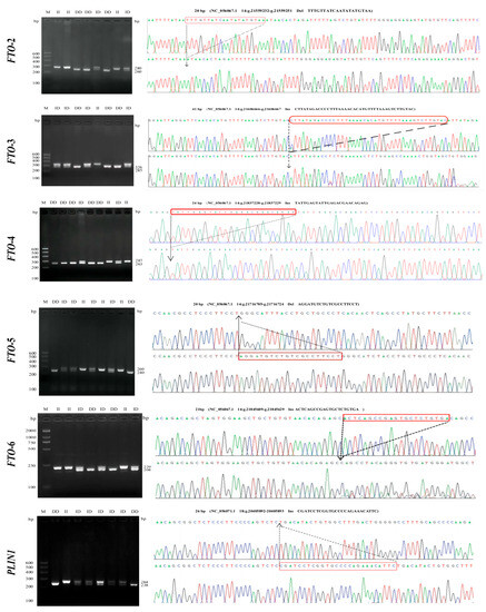 Electrophoresis pattern and sequence maps of six InDels in the FTO and PLIN1 genes.