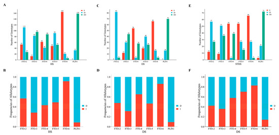The population genetic parameters were estimated for the FTO and PLIN1 genes (Table 3). In the HS population, the I allele was the dominant allele in FTO-2 and FTO-6, and the D allele was the dominant allele in FTO-3, FTO-4, FTO-5, and PLIN1. In the DS population, the I allele was the dominant allele in the FTO-4 and FTO-6, and the D allele was the dominant allele in FTO-2, FTO-3, FTO-5, and PLIN1. In the STHS population, the I allele was the dominant allele in FTO-4, FTO-5, and FTO-6, and the D allele was the dominant allele in FTO-2, FTO-3, and PLIN1 (Figure 2). Based on PIC, FTO-6 and PLIN1 had low polymorphism (0 < PIC < 0.25). The other three InDels were moderately polymorphic (0.25 < PIC < 0.50). A related study of the Tong sheep breed showed results similar to those of the present study. All 10 InDels detected were moderately polymorphic (0.25 < PIC < 0.50), which may be related to environmental factors and genetic differences between the breeds. Except for FTO-2 in the three populations, FTO-4 in the HS population, FTO-5 in the STHS population, FTO-6 in the HS and DS populations, which deviated from HWE (p < 0.05), the remaining groups were in HWE (p > 0.05). The homozygosity of the six InDels (FTO-2, FTO-3, FTO-4, FTO-5, FTO-6, and PLIN1) was higher than the heterozygosity, indicating a small degree of genetic variation. The maximum number of effective alleles in FTO-5 was 1.999 in the HS breed, which suggested that the genetic drift was minimal, and the alleles were evenly distributed in the population.