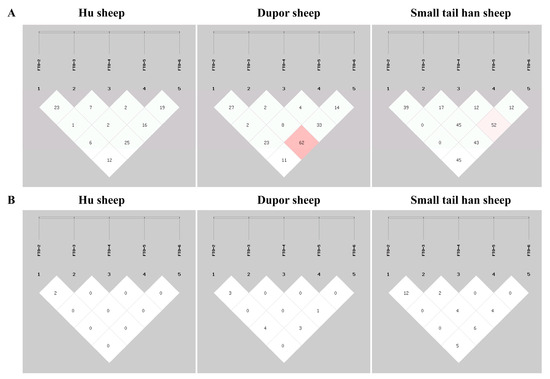 Linkage analysis of five InDels of FTO in three populations. (A) D’ analysis of three sheep breeds in five FTO InDels; (B) r2 analysis of three sheep breeds in five FTO InDels.