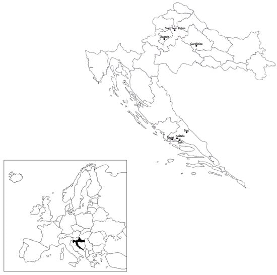 Geographical map of Croatia with locations from which terrestrial and coastal populations of C. perspectalis were collected.