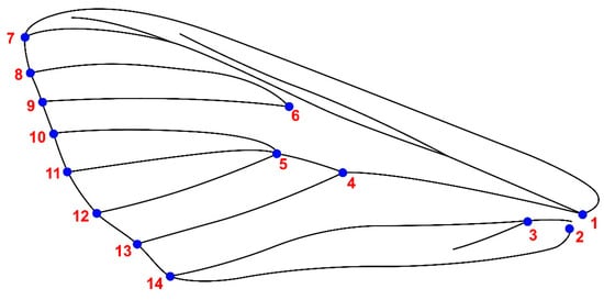 Upper wing images were captured with a Nikon D780 camera, Tokyo, Japan, ensuring individual sharpening and photography for each wing. These images were saved in jpg format and tagged with respective locations. Landmarking was accomplished using tpsDig2 v2.31 software, involving the strategic placement of fourteen landmarks (refer to Figure 2) at vein intersections and edges. Any samples featuring wing damage or overlapping were excluded from subsequent analyses. A comprehensive total of 412 wings (206 left and 206 right wings) underwent a successful preparation process, comprising 222 male (111 left and 111 right) and 190 female (85 left and 85 right) upper wings.