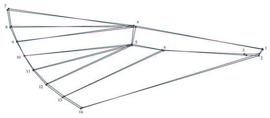 Wireframe representation variations in the average wing shape of box tree moth populations. Green: North, Purple: South.