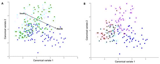 Canonical variate analysis between all populations studied, (A): The line divides two groups of northern (blue) and southern (green) populations. (B): This graph represents a blue tone to represent populations from the north Sveti Ivan Zelina, Garešnica and Zagreb, and from the red tone populations from the south Kaštela, Sinj, Split and Seget.
