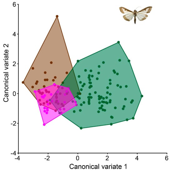 Upon conducting canonical variate analysis (CVA), clear distinctions emerged between the northern and southern populations of C. perspectalis within the Republic of Croatia (Figure 4).