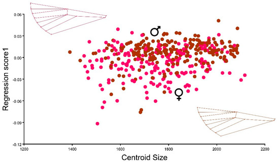 Regarding sexual dimorphism, a multivariate regression analyzing wing shape in relation to centroid size indicated subtle distinctions between the wings of male and female C. perspectalis. While wing shape exhibited variability within the female population, it displayed limited variation among males (ANOVA: F = 19.84 p ≤ 0.0001). Therefore, a subtle sexual dimorphism was found between the observed populations (Figure 7).