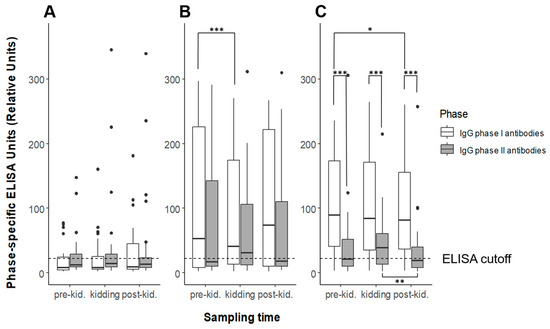 Antibody levels of Coxiella burnetii IgG phase I (white) and phase II (gray) detected with phase-specific ELISAs in three dairy goat herds ((A–C) from left to right) during three sampling dates (pre-kidding, kidding, and post-kidding). Outliers are presented as dots; the black bar marks the median. Positivity threshold: RU ≥ 22. Significant differences between medians are indicated with asterisks: * p < 0.05, ** p < 0.01, *** p < 0.001.