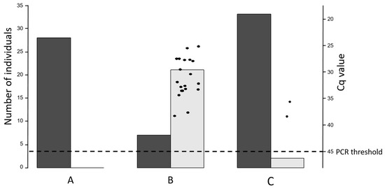 Coxiella burnetii shedding through vaginal mucus at kidding in three dairy goat herds (A–C) analyzed with real-time PCR. The left y-axis indicates the numbers of negative (dark-gray column) and positive (light-gray column) vaginal swabs. The right y-axis and the individual dots demonstrate the Cq values of the positive vaginal swabs. Positivity threshold ≤45 Cq.
