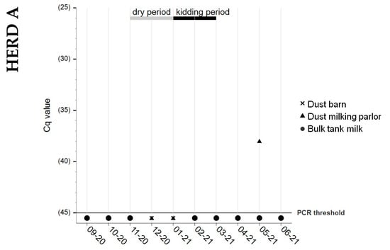 Both types of dust samples from herd A tested negative for C. burnetii DNA, except for one swab from the milking area (Cq 38). On farm B, all dust swabs from the milking parlor tested positive, with a peak at the beginning of the kidding season. The results from the barn dust sampling showed an undulating trend. Stable levels of C. burnetii DNA were obtained from the milking parlor’s dust on farm C, whereas the dust samples from the barn turned negative at the end of the study period. Details are presented in Figure 3.