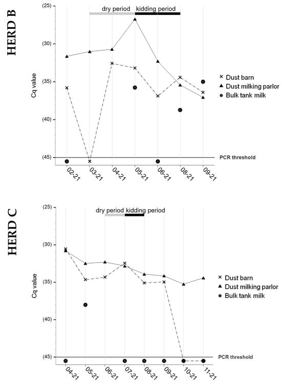 Due to the dry period in every studied herd, BTM samples were not collected for the entire study period. BTM samples from herd A tested negative for C. burnetii DNA during the entire study period (Figure 3). Most BTM samples tested positive during the kidding season and afterwards in herd B. Only one BTM specimen from herd C had detectable C. burnetii DNA (Cq 38), and this was obtained before the dry period started.