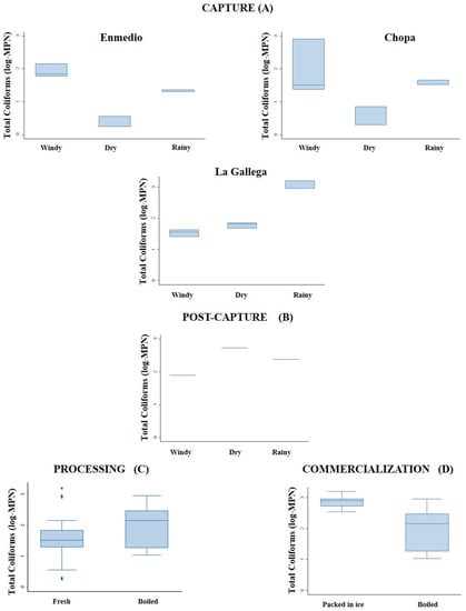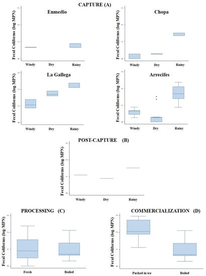 In the post-capture stage, the MPN values for TC and FC in the fresh water that fishers use to preserve their catches prior to commercialization were also found to exceed the allowable limits for potable water (0 MPN for TC) [35]; also, these levels were highest in the rainy season, when according to Cho et al. [36], ambient temperatures tend to rise. The inadequate post-capture handling practices, the limited availability of potable water in the zone and the use of unsuitable recipients provoked high TC and FC concentrations.