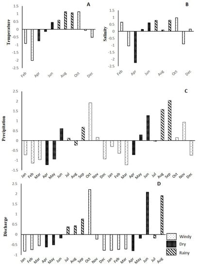 Anomalies of temperature (A) and salinity (B) in the Veracruz Reef System during 2019. Monthly precipitation anomalies (C) in Veracruz from January 2019 to December 2020. Jamapa River discharge rate (D) expressed in anomalies from January 2019 to August 2020.