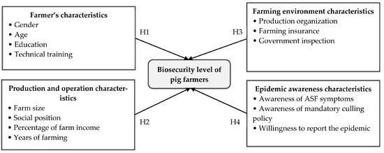 Regarding breeding environment characteristics, farms with a higher level of specialization tend to have a greater awareness of disease control [37]. Farmers who are part of a production organization have access to a wider range of resources, including knowledge, technology, capital, and information, which allows them to improve their biosecurity measures. On the other hand, individual farmers may have less financial resources to allocate towards disease prevention and control. Farmers who take out farm insurance are more likely to improve their biosecurity as they have purchased farm insurance to reduce possible epidemic losses [38]. Government involvement in monitoring farm biosecurity measures puts greater regulatory pressure on farmers [12,39]; therefore, the more frequent the on-site government inspections, the higher the risk of being penalized for not complying with biosecurity control requirements. Consequently, the more stringent the government inspections, the greater the likelihood that farmers will implement the required biosecurity measures. Therefore, the following hypothesis is proposed.