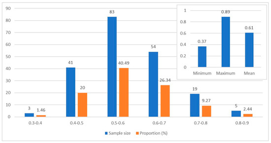 The findings in Figure 3 reveal that the biosecurity levels at the pig farm were generally low, with significant differences observed. Previous studies have suggested that a biosecurity score greater than 0.8 indicates a small risk, while a score greater than 0.6 indicates a medium risk. A score lower than 0.6 indicates a relatively high risk, and a score lower than 0.4 indicates a high risk of biosecurity breach [50]. The sample farmers had an average biosecurity score of 0.61, indicating a medium-level risk. However, this score was considered relatively fragile and at risk of decreasing. The range of scores varied from a minimum of 0.37 to a maximum of 0.89, indicating a significant difference in biosecurity levels among the farmers. The distribution of scores showed that 40.49% of samples scored between 0.5 and 0.6, while 26.34% scored between 0.6 and 0.7. This means that 66.83% of the sample farmers had medium to low biosecurity levels, indicating a potential risk for the expansion of biosecurity risks at any time. Out of all the farms, only 38.05% had a biosafety score greater than 0.6. Among these, only five farms had a score greater than 0.8, which accounted for a mere 2.44%. On the other hand, there were three farms with a score of less than 0.4, accounting for 1.46%. This suggests that there are significant weak links in some aspects of the farmer biosafety system, which has become a bottleneck in the overall effectiveness of the system.