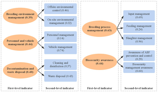 To identify potential weaknesses in the farm’s biosecurity system, a classification analysis was performed on the biosecurity levels. The results, shown in Figure 4, indicate that the first-level indicators were ranked in descending order as follows: breeding process management, biosecurity awareness, personnel and vehicle management, decontamination and waste treatment, and breeding environment management. The study revealed that farmers tend to prioritize breeding process management over breeding environment management. The scores for secondary indicators revealed that slaughter management (0.96) and vehicle management (0.74) were given more importance than other factors, which was in line with the key task of preventing and controlling ASF during production. While most indicators for biosecurity management were satisfactory, scores for personnel management (0.14) and feeding management (0.24) were significantly lower. This highlights major biosecurity shortcomings in these two areas. However, the biosecurity management knowledge score was 0.60, indicating that farmers do recognize the importance of biosecurity management.