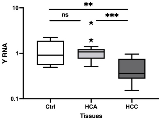 Relative expression of Y RNA in HCA and HCC tissue samples using qRT-PCR. The relative expression level of Y RNA in HCA (n = 15) and HCC (n = 13) versus normal liver tissue (n = 9). The Y-axis represents relative noncoding RNA expression levels in log10 units. One-Way ANOVA (nonparametric) was performed, followed by the Kruskal–Wallis and Mann–Whitney tests. Differences were considered significant when the p-value was < 0.05 (** p < 0.01, *** p < 0.001). ns: not significant; Ctrl: Control; HCA: Hepatocellular adenoma; HCC: Hepatocellular carcinoma.