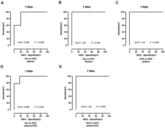Diagnostic potential of Y RNA as a biomarker. (A,B). ROC curve (plasma) of Y RNA for differentiating HCA (n = 5) and HCC (n = 7) group from Healthy controls (n = 6). (C). ROC curve of Y RNA for differentiating HCC (n = 7) from HCA (n = 5). (D). ROC curve (plasma Evs)) of Y RNA for differentiating HCC (n = 9) from Healthy controls (n = 6) (E). HCC (n = 9) versus HCA (n = 5). Ctrl: control; HCA: Hepato-cellular adenoma; HCC: Hepato-cellular carcinoma; EVs: Extra-cellular vesicles.