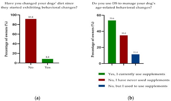Diet change and the use of dietary supplements to manage age-related behavioral changes. (a) Less than 10% of owners changed their dog’s diet to manage behavioral changes. (b) About half the owners currently give dietary supplements.