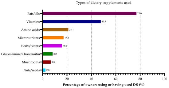 The most used DSs, overall, were fats and oils (77%), followed by vitamins (48%), amino acids (21%), micronutrients, such as iron, selenium, calcium, and other minerals (17%), and dried herbs and plants (16%) (Figure 2). Few owners reported using combination supplements. A total of 6% of owners used Aktivait®, 3% used Denamarin®, and 0.4% used Senilife®.