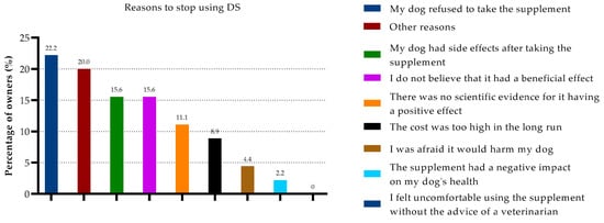 A total of 11% of participants reported using supplements in the past to treat age-related behavioral changes. Most often, the reason for cessation was the palatability issue of the dog not eating the DSs (22%), the lack of a positive effect (16%), the occurrence of side effects (16%), or “other” reasons (20%) (Figure 4).