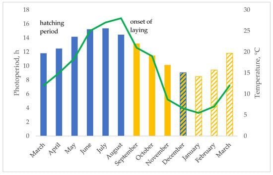 Photoperiod (bars) and outdoor temperature (line) from the hatching to the onset of laying and throughout the laying period. The bars indicate the length of the natural photoperiod throughout the life of the studied birds: growing period (full blue bars), first laying period (full yellow bars) under natural photoperiod, start of artificial lighting implementation (from the second half of month, diagonal blue-yellow bars), second laying period under implemented photoperiod (diagonal yellow bars).
