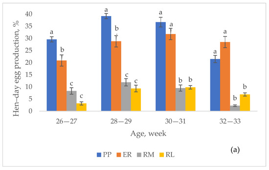 In Figure 2, the effect of breed on the hen–day egg production, according to the age of the hens, and per each laying period, is shown. Throughout the first period (Figure 2a), PP was higher than ER (p < 0.05) from 26 to 29 weeks of age, and then they were similar; they were constantly higher (p < 0.05) than RM and RL, which were similar. At the second period (Figure 2b), each breed, with the exception of PP and RL, showed, at least once, a hen–day egg production higher (p < 0.05) than that of the other groups, according to the age. A higher hen–day egg production than the other groups was seen in ER at 42–43 (p < 0.05) and at 52–53 weeks (together to RM) in RM, from 48 to 53 weeks (p < 0.05). PP showed lower (p < 0.05) values than the other groups at 42–43 weeks, from 48 to 53 weeks, than RM and ER at 52–53 weeks. From 44 to 47 weeks, all the breeds showed the same hen–day egg production.