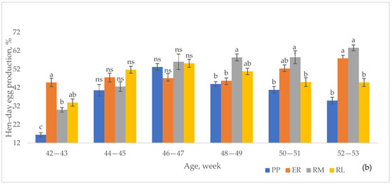 Effect of the breed on hen–day egg production (lsmeans ± SE) according to the age of the hens throughout first (a) and second (b) period. Different letters between breeds within age indicate different values. a, b, c: p < 0.05. ns: not significant. Breeds: Pepoi (PP), Ermellinata di Rovigo (ER), Robusta Maculata (RM), Robusta Lionata (RL). Observations (n): first period = 14 per each age and breed, second period = 14 per each age and breed.
