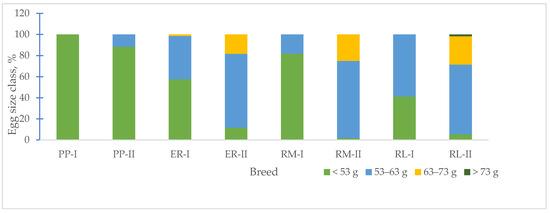 An important egg trait characterizing a breed is the egg weight (Figure 3). As known, the egg size changes with the age of the hen [15]; the changes in egg weight per each breed showed an increased frequency percentage of the medium- and large-size class for ER, RM and RL. For the PP eggs, the changes in size were smaller than those of the other groups. It seems that for this breed, characterized by a body weight of about 1.3 kg, reached at the beginning of the laying activity, from the onset of laying to 53 weeks of age, little changes occurred on the egg formation and size. Under outdoor rearing conditions, the egg weight could be affected by the delay in the onset of laying according to the natural environmental factors due to the season, but other factors, such as diet [31], size of the hens and breed, may be involved.