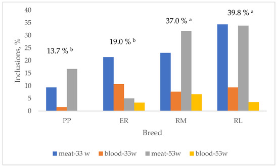Effect of breed on total egg inclusions. Breeds: Pepoi (PP), Ermellinata di Rovigo (ER), Robusta Maculata (RM), Robusta Lionata (RL). The differently coloured bars indicate meat (albumen) and blood (yolk) inclusions per each age (-33 w = 32–33 weeks; -53 w = 53 weeks). Different letters between breeds indicate different values. a, b: p < 0.05; ns: not significant. Observations (n): PP (64 at 32–33 weeks, 60 at 53 weeks), ER (56 at 32–33 weeks, 60 at 53 weeks), RM (13 at 32–33 weeks, 60 at 53 weeks), RL (32 at 32–33 weeks, 56 at 53 weeks).