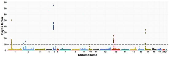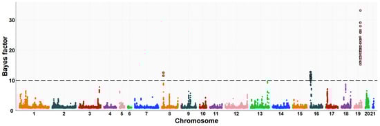 Manhattan plot of the genome-wide association study for intramuscular fat of Longissimus thoracis et lumborum muscle in rabbits using the Bayes factors by each SNP along the rabbit chromosomes under the MGWA model. The Bayes factor threshold of 10 is indicated by the black dashed line.