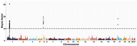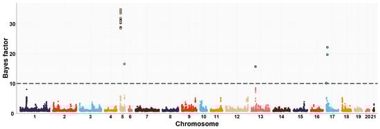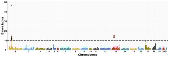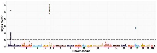 Manhattan plot of the genome-wide association study for polyunsaturated fatty acids (PUFA) of Longissimus thoracis et lumborum muscle in rabbits using the Bayes factors by each SNP along the rabbit chromosomes under the MGWA model. The Bayes factor threshold of 10 is indicated by the black dashed line.