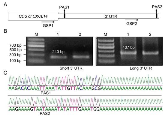 Characterization of APA isoforms of CXCL14 gene. (A) Schematic representation of the CXCL14 3′ UTR region. The horizontal arrows indicate the position of the GSP used during 3′ RACE; the position of the proximal PAS (PAS1) and the distal PAS (PAS2) in the 3′ UTR of CXCL14 are shown by vertical arrows. (B) Agarose gel electrophoresis profile of the 3′ RACE product of the CXCL14 gene. The left and right panel indicate the short and long APA isoforms of the CXCL14 gene, respectively. M: Molecular weight size marker; Lanes 1 and 2 represent two replicates, respectively. (C) The upper and lower panels represent the Sanger sequencing peak maps of the 3′ UTR ends of the short and long APA isoforms of the CXCL14 gene, respectively. PAS1 and PAS2 sequences are underlined.