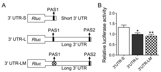 Investigation of the effect of different CXCL14 3′ UTRs on protein expression by luciferase reporter assay. (A) Schematic diagram of the CXCL14 3′ UTR-APA isoform’s luciferase reporter recombination. (B) Short 3′ UTR of CXCL14 significantly increases the luciferase activity. Renilla luciferase activity was normalized to firefly luciferase activity. All values are represented as means with error bars representing SEM (n = 4). *, p < 0.05; **, p < 0.01.
