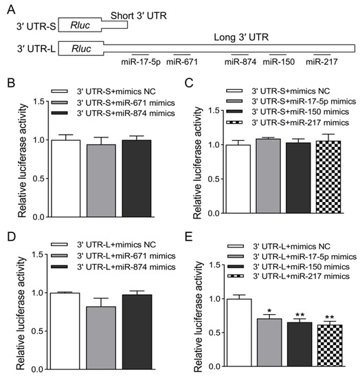 To further explore the potential mechanism that the long 3′ UTR isoform of CXCL14 is lower in mRNA and protein expression than the short 3′ UTR isoform, we speculate that there may be one or more miRNA-binding sites on the long 3′ UTR of CXCL14 to inhibit its expression. The online software TargetScan 8.0, miRanda v3.3a, RegRNA 2.0, and RNA22 v2 were used to search potential miRNAs predicted to bind the 3′ UTR. After comprehensive analysis of the predicted miRNAs, we selected five putative miRNAs binding to long 3′ UTR, namely, miR-17-5p, miR-150, miR-217, miR-671, and miR-874, for subsequent experimental verification. The binding sites of these miRNAs to CXCL14 are only in its long 3′ UTR, and there is no binding site in its short 3′ UTR (Figure 4A). To verify whether the predicted miRNAs have regulatory effects on the CXCL14 gene, the synthetic miR-17-5p, miR-150, miR-217, miR-671, and miR-874 mimics were co-transfected with 3′ UTR-S or 3′ UTR-L into HEK293T cells, respectively. The results showed that all the 3′ UTR-S + miRNA mimics groups did not significantly reduce the 3′ UTR-S luciferase activity compared with the 3′ UTR-S + mimics NC group, indicating that there is no true binding target for them in the short 3′ UTR (Figure 4B,C). Compared with the 3′ UTR-L + mimics NC group, the luciferase activity in the 3′ UTR-L + miR-671 or miR874 mimics group was not significantly reduced (Figure 4D), but the luciferase activity in the 3′ UTR-L + miR-17-5p, miR150, or miR-217 mimics group was significantly reduced (Figure 4E).