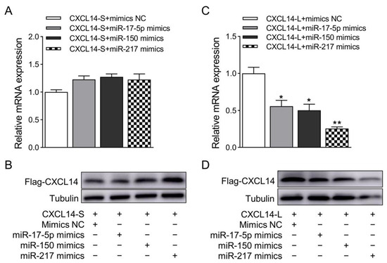 Next, miR-17-5p, miR150, and miR217were co-transferred into HEK293T cells with CXCL14-S or CXCL14-L, respectively. The results showed that miR-671 and miR874 did not significantly down regulate the mRNA and protein expression levels of the CXCL14 gene with short 3′ UTR (Figure 5A,B). However, they significantly down regulated the mRNA and protein expression levels of the CXCL14 gene with long 3′ UTR (Figure 5C,D). Together, these results indicated that miR-17-5p, miR150, and miR217 could bind to the long 3′ UTR of the CXCL14 gene to inhibit its expression.