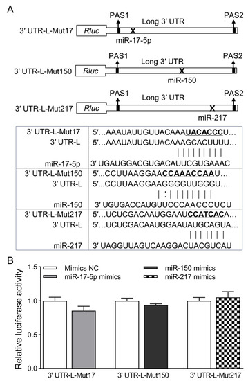 To further verify the specific effects of miR-17-5p, miR150, miR217 on CXCL14 long 3′ UTR, site-directed mutagenesis was used to mutate the three miRNAs binding sites of the 3′ UTR-L recombinants to form mutations recombinant: 3′ UTR-L-Mut17, 3′ UTR-L-Mut150 and 3′ UTR-L-Mut217 (Figure 6A). These mutant recombinants were co-transfected with NC, miR-17-5p, miR-150 and miR-217 in HEK293T cells, respectively. After 48 h, luciferase activity was detected. The results showed that, compared with the NC group, there was no significant difference in luciferase activity in the group of 3′ UTR-L-Mut17, 3′ UTR-L-Mut150, and 3′ UTR-L-Mut217 (Figure 6B). This result further confirms that miR-17-5p, miR-150, and miR-217 could indeed bind to the long 3′ UTR region of the CXCL14 gene.