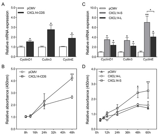 The formation of fat is not only the process of preadipocyte differentiation into adipocytes, but also involves the process of cell proliferation. To analyze whether CXCL14 plays a role in the stage of preadipocytes proliferation, CXCL14 was overexpressed in 3T3-L1 preadipocytes, and then the expression of cell proliferation marker genes CyclinD1, CyclinE, and Cullin3 was detected by qRT-PCR. The results showed that compared with the control group, overexpression of CXCL14 significantly increased the mRNA expression levels of CyclinD1, Cullin3, and CyclinE (Figure 7A). Subsequently, the CCK-8 assay was used to detect the effects of CXCL14 overexpression on the proliferation of 3T3-L1 preadipocytes at different time points. The results showed that compared with the control group, the overexpression group could promote the proliferation of 3T3-L1 preadipocytes, especially at 48 h (Figure 7B). To further explore the effect of different length 3′ UTR-APA isoforms of the CXCL14 gene on the proliferation of 3T3-L1 preadipocytes, pCMV, CXCL14-S andCXCL14-L were transfected into 3T3-L1 preadipocytes. The expression levels of CyclinD1, Cullin3, and CyclinE were detected by qRT-PCR after 24 h. The results showed that compared with the control group, the expression levels of cell proliferation marker genes CyclinD1, Cullin3, and CyclinE in the CXCL14-S and CXCL14-L groups were significantly upregulated, and the expression levels in the CXCL14-S group were higher than those in the CXCL14-L group (Figure 7C). The proliferation of preadipocytes cultured for different times was detected by CCK-8 assay. The results showed that, compared with the control group, the transfection of CXCL14-S and CXCL14-L groups could promote 3T3-L1 preadipocyte proliferation, but the transfection CXCL14-S group had a more significant promotion effect than the CXCL14-L group, and the promotion effect showed a significant level after 48 h (Figure 7D). These results showed that overexpression of the CXCL14 gene can significantly promote the proliferation of 3T3-L1 preadipocytes, and the short 3′ UTR-APA isoform of CXCL14 has a more significant promoting effect on 3T3-L1 preadipocyte proliferation than the long isoform, indicating that APA of CXCL14 is involved in the regulation of the stage of 3T3-L1 preadipocyte proliferation.