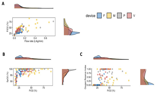 Dot plot and paired density plot of (A) the inspired fraction of oxygen (FiO2) achieved for each device at any flow rate; (B) value of SpO2 over FiO2; (C) value of ORi over FiO2. The following administering methods were used: a cannula placed 2 cm from the nostril (F); nasal prongs (P); a tight-vented mask (M); or a tight mask connected to a Venturi valve (V) delivering a fixed oxygen fraction of 40%.