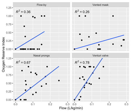 The linear regression between the oxygen flow rate over body weight and the ORi indicated a good correlation in the four methods (Figure 2, Table 5). The best correlation was observed with the Venturi valve, with an r2 of 0.78 (p < 0.001).