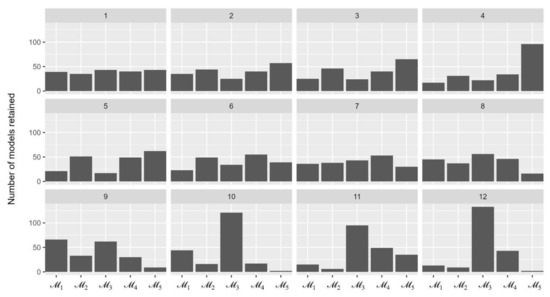 Figure 2 illustrates the number of five models being retained over 12 sequences. The most retained model in the last sequence was with 133 out of 500 times being selected, followed by (43 times), (13 times), and (9 times). This resulted in the Bayes factors of compared with other models to be between 3.1 and 66.5 and, therefore, was selected for the inferring process of parameter values.